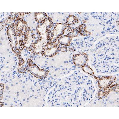 Western blot analysis on SW480 cell lysates using anti- CLDN7 mouse mAb. Immunohistochemical analysis of paraffin-embedded Human kidney using anti-CLDN7 antibody. The section was pre-treated using heat mediated antigen retrieval with Tris-EDTA buffer (pH 8.0-8.4) for 20 minutes.The tissues were blocked in 5% BSA for 30 minutes at room temperature, washed with ddH2O and PBS, and then probed with the primary antibody (M1412-2, 1/100) for 30 minutes at room temperature. The detection was performed using an HRP conjugated compact polymer system. DAB was used as the chromogen. Tissues were counterstained with hematoxylin and mounted with DPX.