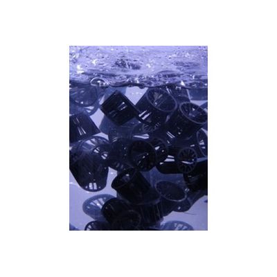 The MBBR system consists of an aeration tank (similar to an activated sludge tank) with special plastic carriers that provide a surface where a biofilm can grow. The carriers are made of a material with a density close to the density of water (1 g/cm3). An example is high-density polyethylene (HDPE), which has a density close to 0.95 g/cm3. The carriers will be mixed in the tank by the aeration system and thus will have good contact between the substrate in the influent wastewater and the biomass on the carriers.