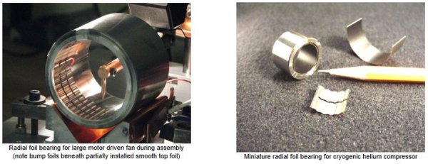 Foil bearings offer levels of performance and efficiency unmatched by conventional bearings for high-speed machinery. Ideally suited for use in hostile environments or oil-free systems, these bearings are more resilient and tolerant to misalignment than solid-pad gas bearings. MSI`s hydrodynamic (self-acting) compliant foil bearing generates its own load-carrying film from the rotation of the shaft it supports. A smooth top foil forms the bearing surface, and a flexible `bump` foil provides this surface with controlled, resilient support. This proprietary design ensures a `self-adjusting` bearing with inherent internal damping. It adapts to shaft misalignment, variations due to tolerance buildups, centrifugal and thermal shaft growth, and differential thermal expansion. Air-cycle machines, high-speed motors, and oil-free cryogenic compressors are among the many types of machinery that can benefit from foil bearings.