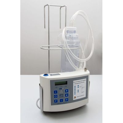 The new powerful electronically controlled mobile low vacuum system offers a great range of applications independent of fixed vacuum and power supplies: Apart from typical mobile post-operative pleura care, the new and more powerful system can be used for further appliances, which require e.g. a higher vacuum or special programme sequences. A maximum vacuum of -550 mbar and a totally free programmability open up a very broad field of applications as well as a high individuality. The vacuum system consists of a powerful low vacuum suction pump, a single-use system of secret bottles, vacuum tubes and bacteria filter. The system is supplemented by a set of pump and bottle holder to fix pump and bottles at any hospital bed.