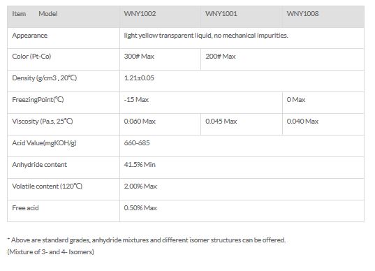 Methyl tetrahydrophthalic anhydride (MTHPA, MeTHPA) is a high performance product of anhydride curing agent. Our MTHPA products of WNY-1002 series has excellent performance when reacting with epoxy resins. Its characteristics include high purity, light color, low viscosity, low volatility, low toxicity, low heating loss, stable performance, long pot life, and freezing point. It can be long-term stored at low and room temperature. The specific characteristics are as follows: