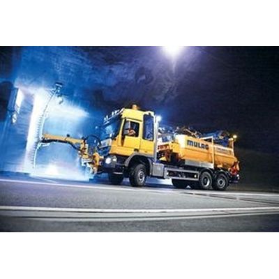 With the newly developed tunnel cleaner TWG 600-L, a cleaning system has been provided that not only washes the ceilings and walls of tunnel sections but also allows for efficient cleaning of niches and road surfaces. It is equipped with a powerful high-pressure water pump with an input of 100 kW. At its maximum delivery rate, it distributes the contents of the large 13,500 litre tank in about 35 minutes.