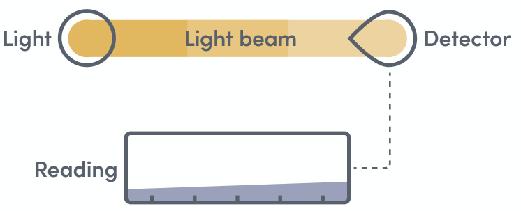 To understand how this works, start by imagining a single-beam sensor. A single light source sends a single beam to a single detector which records the intensity of the light it receives. That light intensity will be affected by four variables: the distance between the light and the detector (since intensity reduces over distance), the intensity of the beam generated by the light itself, the characteristics of the detector, and absorption by anything in the water like suspended solids or dyes.