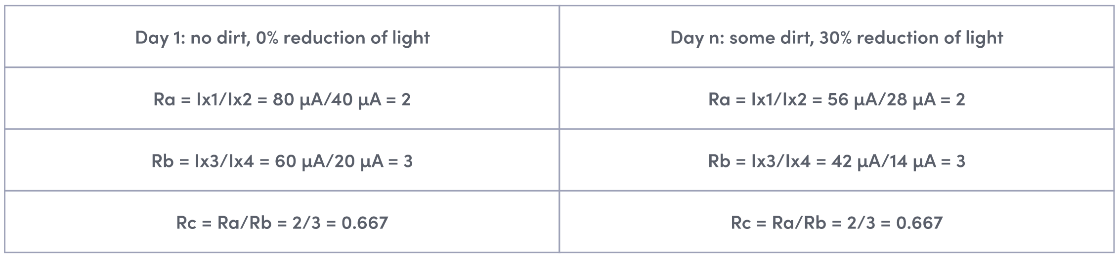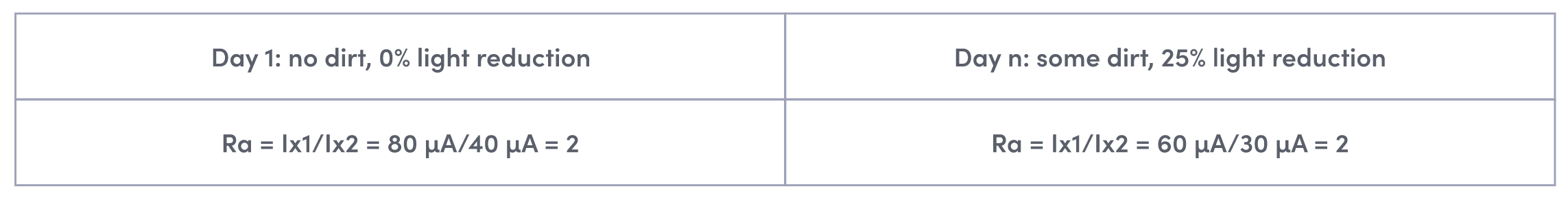 Because detector 2 is further away on the long path, it receives a lower intensity of light. These two light paths can be used to create a light intensity ratio: Ra = Ix1/Ix2 Because there are two detectors receiving the light source, this ratio compensates for any changes in light intensity, like changes caused by dirt building up on the sensor and restricting the light path. If there are any changes, they affect each light path equally and the ratio cancels out the difference. For example, if accumulated dirt means the light reaching each detector reduces by 25 percent, the ratio stays the same.