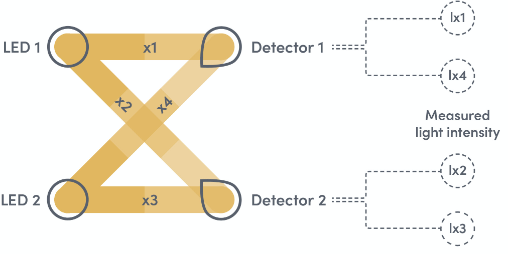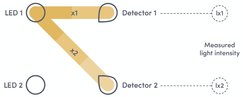 Each Phathom sensor has two LED light sources and two light detectors. LED 1 switches on and the light is picked up by detector 1 and detector 2. Then LED 1 switches off and LED 2 switches on. Again, the light is picked up by detector 1 and detector 2.