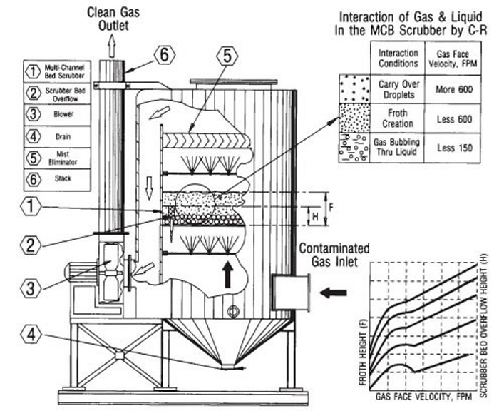 The Clean AIr Group, LLC Multi-Channel Bed Scrubber (MCBS) is designed to collect particles above 2 microns with 99°/o efficiency. The MCBS system utilizes a turbulent layer of liquid, air, bubbles and mist for 99°/o scrubbing efficiency of SO2, HCI, gas cooling and odor control. Continuous self-cleaning eliminates clogging, even with tar mist.