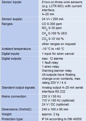 - Two alarm thresholds for each sensor, independently adjustable from 5 % to 100 % of the measurement range; facility for forming half-hourly average value