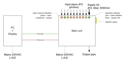 The grain composition measurement system is based on the laser diffraction phenomenon. The system of pneumatic valves allows for any switching between measuring channels. The system can measure individual channels in any combination, in appropriate periods and taking into account the priorities you define.