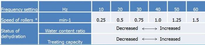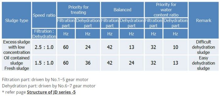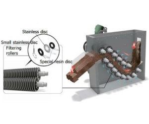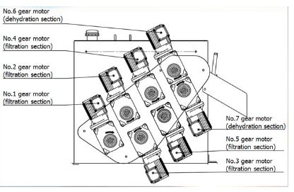 Number of filtering rollers, each of which consists of a stainless steel shaft and multiple thin discs, are placed in two rows, upper and lower. The rollers close to the sludge inlet form the filtration section, and the rollers closed to the outlet form the dehydration section.