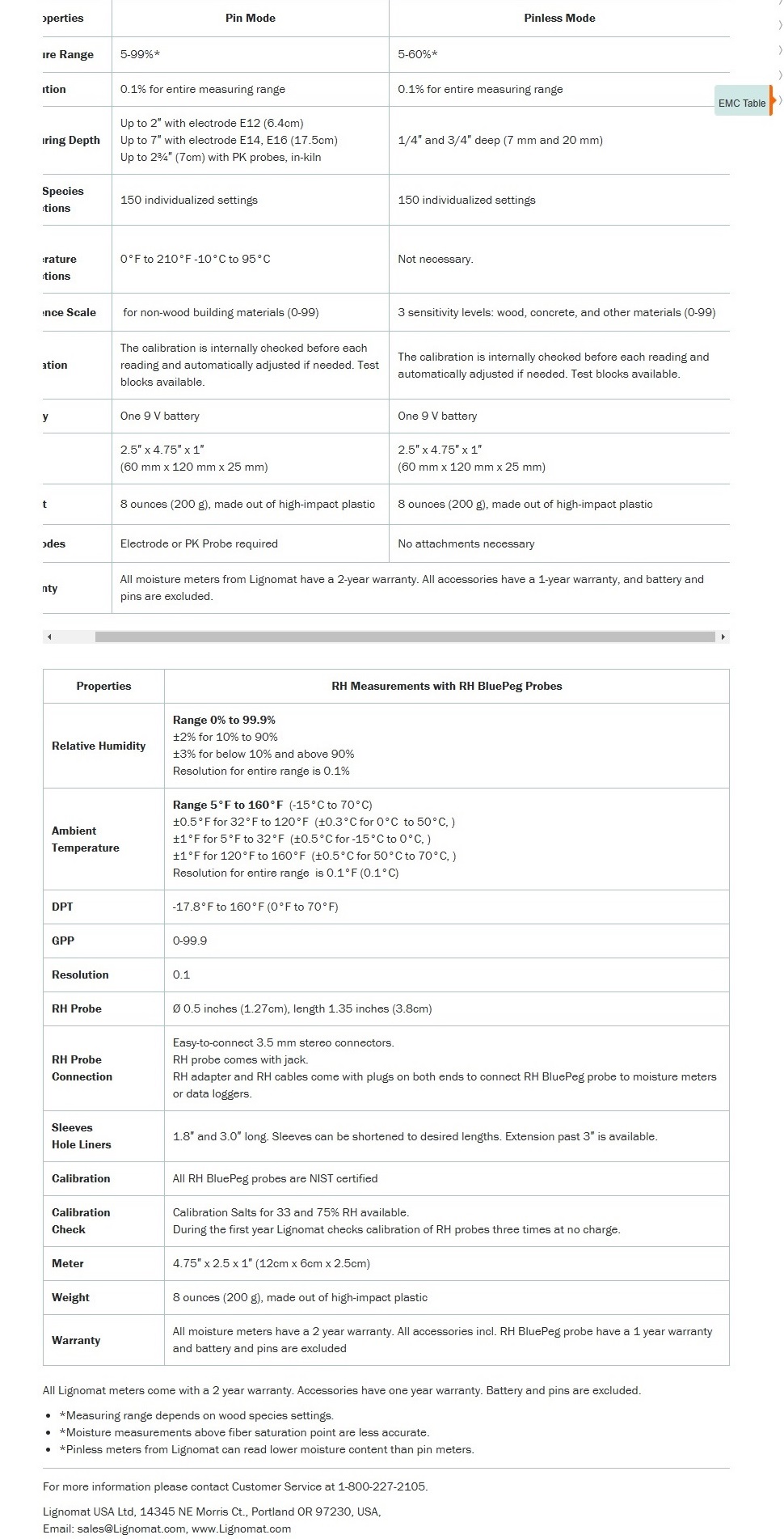 Pinless Mode: Lignomat’s unique pinless measuring technology assures calibration accuracy, reliability and dual-depth measuring capability, measuring depth 1/4″ and 3/4″. The meter indicates wood moisture in percent, corrected for 150 different settings. Specific gravity can also be entered to correct for different wood species, settings between 30-100 (0.3 – 1.0).
