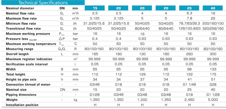 Multi-Jet Dry Type. 360° rotatable cover. Display on 5 drums m3 and 4 pointers for litres. Optional check valve. Magnetic field protection. Measuring range up to R80. Optional pulse, M-bus Radio frequency output. Hermetically sealed register (IP68). Brass housing. Water temperature up to 50°C .