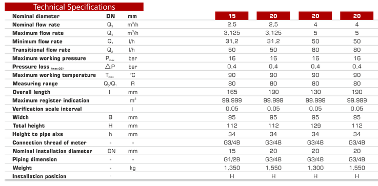 Multi-Jet Dry Type. 360° rotatable cover. Display on 5 drums m3 and 4 pointers for litres. Optional check valve. Magnetic field protection. Measuring range up to R80. Optional pulse, M-bus Radio frequency output. Hermetically sealed register (IP68). Brass housing. Water temperature up to 90°C.