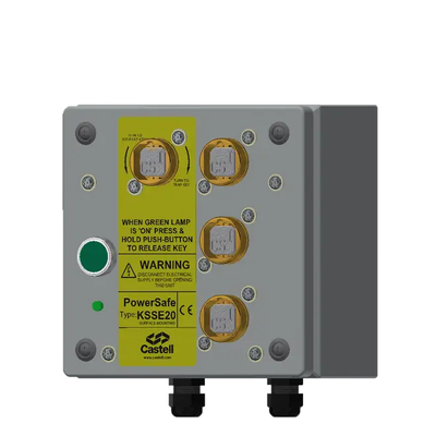 The KSSE is a solenoid controlled, multi-key electrical switch for the controlled isolation of low current. This product is used where the controlled isolation of a machine needs to take place, i.e. where a robot has to finish a cycle prior to isolation and where multiple entry points to the protected area are required. The solenoid is continuously rated, and its position is electrically monitored. This type of isolator should be used for short term, off load isolation. The unit is supplied capable of being mounted into an existing panel or for surface mounting within its own IP65 rated lockable steel enclosure. The KSSE is manufactured from either brass or stainless steel.