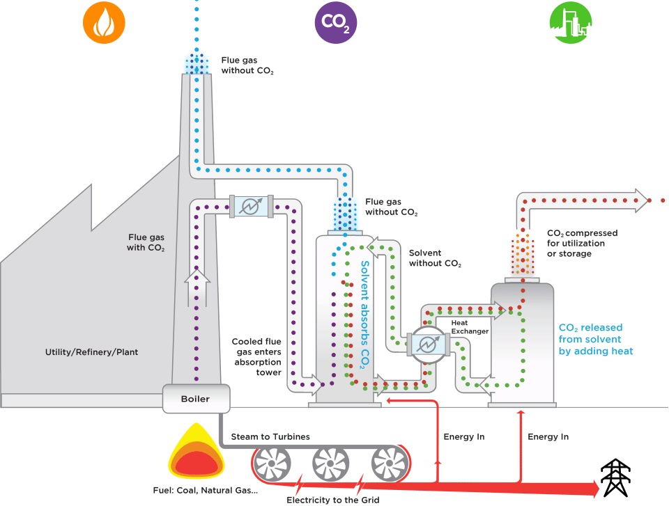 The ION absorbent, now loaded with CO2 (“rich solvent”) is directed to the regeneration section of the process. The Liquid Absorbent is then heated, which strips our the CO2. The captured CO2 is then sent to be compressed and transported for utilization in a variety of industries or for permanent sequestration.
