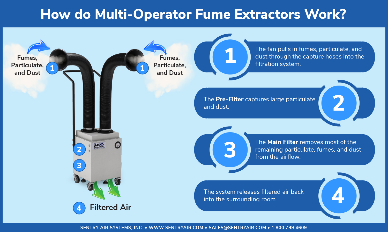 Sentry Air Systems Multi-Operator Fume Extractors are designed and manufactured to provide multiple outlets to perform applications that require filtration at separate working stations. In some cases housing multiple air filtration systems can be bulky, aesthetically displeasing, or not feasibly applicable to allotted square footage; in these instances, it is recommended that a multi operator fume extractor be implemented as safety control against dust and particulates.