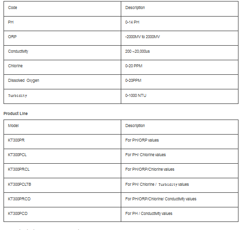 The KT300 is a dedicated multi-parameter controller for complex applications that require a number of chemical parameters to be checked at the same time. The unit features independent proportional control output measures, two programmable frequency outputs RS 485 serial port with MODBUS protocol, and so on.