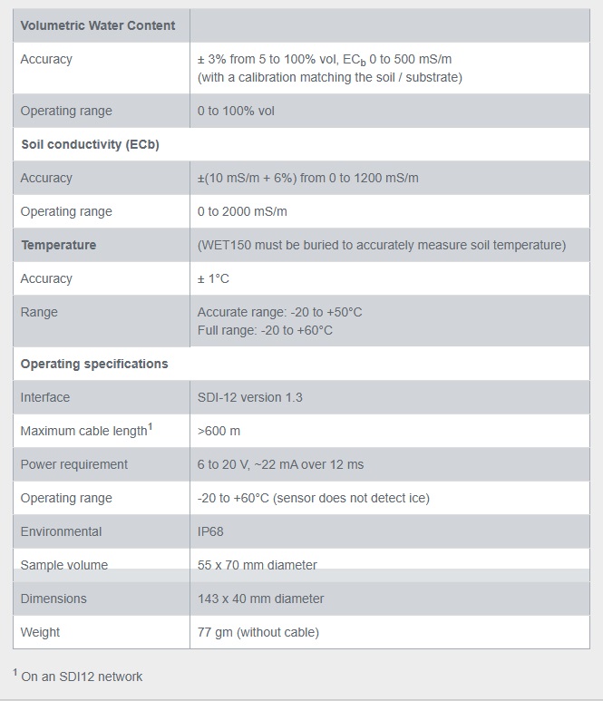 The WET150 is a dual purpose soil moisture sensor. It can be installed in soil or substrate and connected to a SDI-12 master device (e.g. data logger) to provide long-term moisture, temperature and EC data. Alternatively it can be used in Kit form as a portable sensor connected to the WET150 readout meter to take instant spot measurements of moisture content and EC (when used in portable mode the WET150 Sensor does not provide temperature indication).