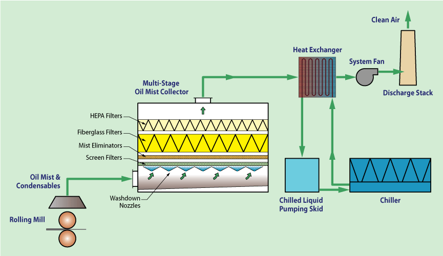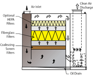 Provides more filter media, longer operating time between filter changes, and higher collection efficiency. The Monroe Multi-Stage Oil Mist Collector is designed to collect and remove airborne oil mist, smoke, and submicron vapors generated by operations such as high production machining and cold forming. It is a multiple stage collector that has proven capabilities exceeding 99% efficiency on many installations.