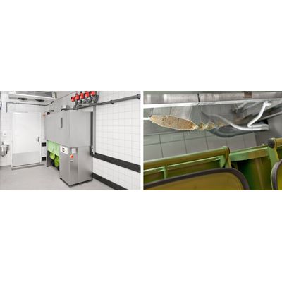 Our Multi-Transfer Bio-Grinders are designed for larger facilities with multiple kitchens. Up to 8 Bio-Grinders can be placed in various locations within your kitchen, or in various kitchens on different levels or locations of your building(s). It munches your food waste (and compostable packaging), and then automatically transfers the food pulp using a standard 2 inch interconnected vacuum pipe system. These pipes converge to a centralized collection point (e.g. a loading dock or waste room) where it can be paired with any of our Giants for further processing.