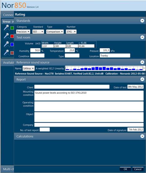 The new module is following the same graphical user interface principles as the Building Acoustic module. That means the operator make a pre-selection of the appropriate Standard to follow, and the system is ready for use immediately after entering essential information such as size of object, etc. Supported Standards are the ISO 3741, ISO 3743-1, ISO 3743-2, ISO 3744, ISO 3745, ISO 3746, ISO 3747 and ISO 6395.