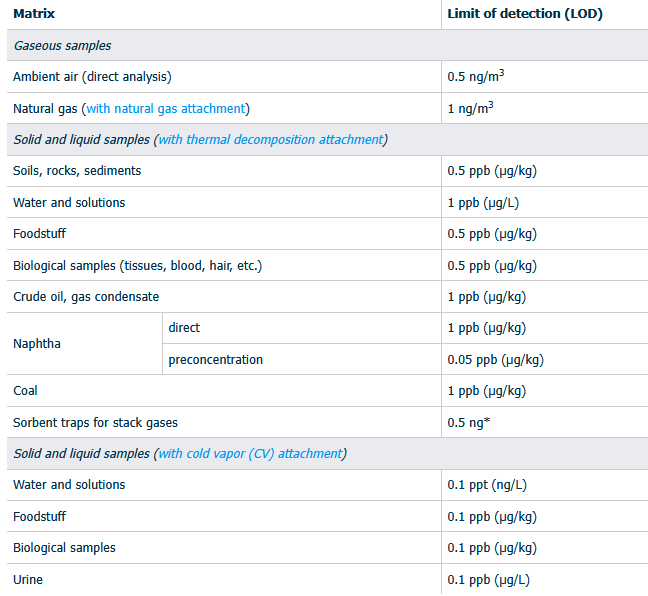 - Measurement principle: Atomic absorption spectrometry at 254 nm with Zeeman correction of background absorption