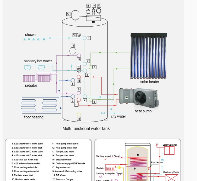 Amitime`s multi-functional water lank has three coils inside, one 10M long coil for solar system, and two 20M coils for sanitary water (to ensure the reliability of the sanitary water). All these coils are made from high quality 304 stainless steel. All standard Multifunctions tanks also integrate a 2KW electric heater with mechanical controller, 10L expansion tank, Magnesium Sacrificial Anodes, Pressure Gauge, Temp / Pressure Relief valves and a purge valve. Both hotwaterforfloor heating or radiators and hot sanitary water are provided from this tank