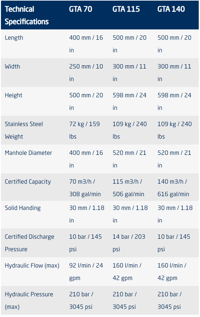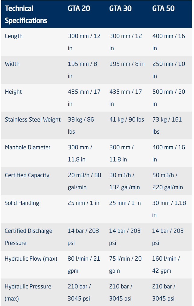 The whole GTA pump range has been extensively tested in the field and has received accreditation from Bureau Veritas confirming their recovery capacities in oils of varying viscosity.