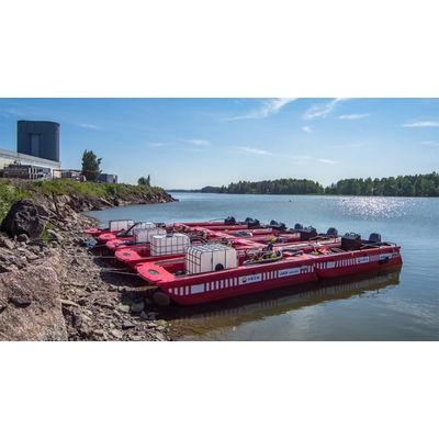 The Lamor Seahunter is a multipurpose work platform that consists of connectable hulls, in the most basic configuration only one motor hull, but the possibilities are endless as additional cargo hulls can be quickly connected to the motor hull if the need arises. The platform is ideal for assisting in skimming and clean-up operations near shore and in rivers and lakes. The hulls are catamaran shaped which provides a stable work platform for oil recovery operations. The platforms are connected to each other in a configuration with quick locking pins. The outboard engine is fitted with propeller protection.