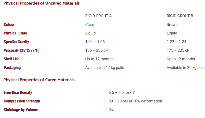 RIGID GROUT is a low-viscosity, dual-component, hydrophobic polyurethane grout designed to stabilize water-bearing soils and fill open voids. When RIGID GROUT A is combined with RIGID GROUT B, the mixture produces a strong, hard foam that expands to approximately 10 times its original volume. This expansive foam provides structural support and develops an adhesive bond to loose substrates, making it ideal for filling voids adjacent to concrete structures, foundations, and roadways where settlement has occurred. RIGID GROUT is solvent-free, non-toxic, and offers fast foaming and curing for efficient installation.