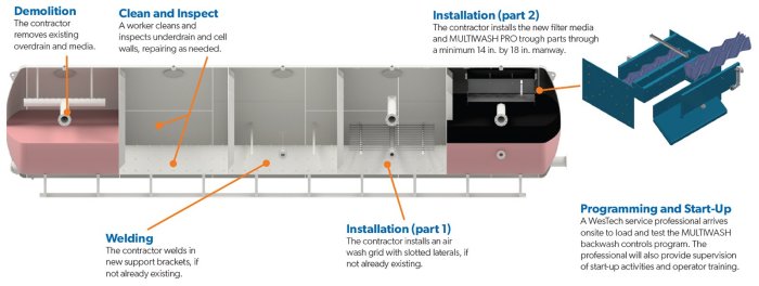 The MULTIWASH PRO trough is an integral part of the superior cleaning system known as the MULTIWASH backwash process, which simultaneously combines air and water in an efficient backwash. For an installation at your site, simply provide a few measurements, the current operational sequences, and the piping lay out, and our engineering staff will help you upgrade to the MULTIWASH PRO trough.