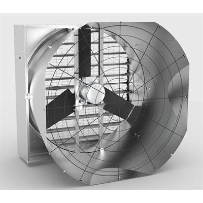 EC52D delivers a large amount of air, maintaining reliability and energy efficiency, with an extremely smooth noise emission. The direct drive motor is a maintenance-free solution for the ventilation system, as there is no longer need to verify the integrity of the transmission components: v-belts, pulleys etc. The patented Anti-Gravity, the innovative opening system based on a “counter phase” movements of the shutter blades, guarantees the highest tightness to light and air when the fan is off. The square fan housing, the discharge cone, shutter blades and the air-conveyor (venturi) are made of the well proven corrosion resistant steel with Munters Protect coating. The design of the 4 cone sectors is specifically designed to reduce the space required by the fan when installed on the gable end.