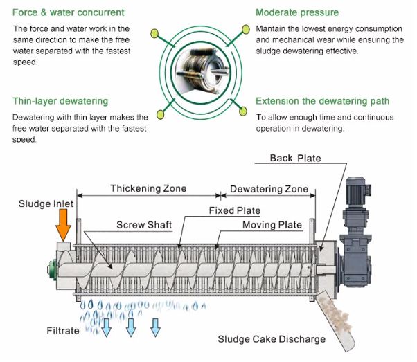 Due to the moving of the fixed rings and moving rings self -cleaning .The ubiquitous clogging is avoided .Handing oily sludge without trouble while separating the water from the sludge easily . Above all , no need large quantiry of flushing water and no odor ,no secondary pollution during the sludge dewatering process .