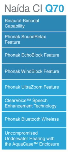 The Nai´da CI Q70 sound processor from Advanced Bionics provides unique, groundbreaking features that help you to effortlessly hear in any environment. The technologies of AB and Phonak, the innovation leaders in cochlear implants and hearing instruments, have evolved to provide advantages no other manufacturer can match.