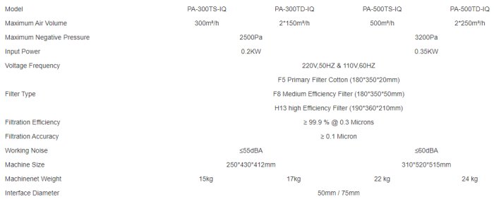 - TS-IQ, TD-IQ, FS-IQ series are equipped with low power consumption, maintenance-free, high-volume brushless fans, stable operation and long service life. The TS-LD-HP-IQ series is equipped with a high negative pressure brushless fan with large suction power;
