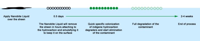Nanobite Liquid, known as Oilgone in the USA, Australia and Nigeria, is applied as a thin layer to the sheen using conventional liquid spraying equipment. Nanobite Liquid will bond with the sheen and floating oil into “gel like balls” that are many orders of magnitude smaller than the area of the sheen. These ‘balls’ then can be collected using traditional skimming equipment or because they remain on the surface will bio-remediate into carbon dioxide and water. The sheen will disappear (visual effect) in minutes or hours, not days and weeks. At the same time the ‘gel’ remains on the surface for a proper and complete biodegradation of the contaminant by indigenous microbes. The microbes population will quickly grow and convert the hydrocarbon into carbon dioxide and water. Once the contaminant is eliminated, the micro-organisms return to their sustainable population that existed before the incident.
