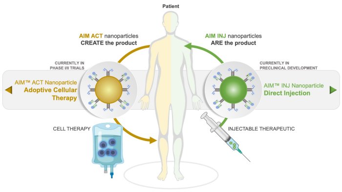 The AIM technology enables us to construct “synthetic dendritic cells,” in the form of AIM nanoparticles, which are capable of directing a specific T cell-mediated immune response. Mimicking dendritic cells, the AIM nanoparticles employ natural signaling proteins to deliver specific instructions to T cells that direct a desired immune response. Importantly, unlike other cell therapy approaches, this is accomplished without any genetic manipulation of the T cell, thereby creating T cell products that should maintain natural target identification, engagement, and killing mechanisms.