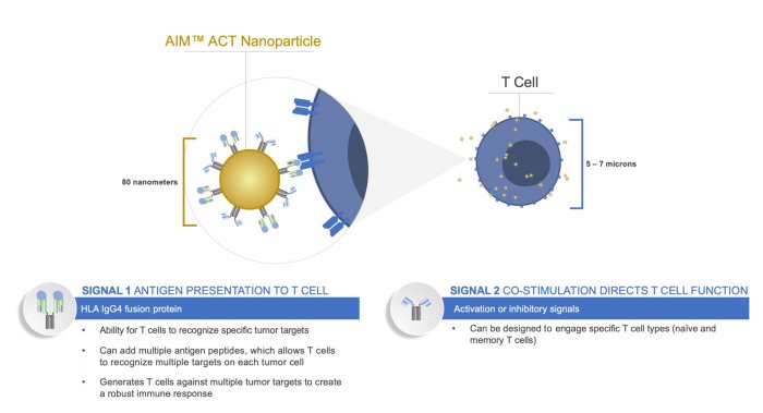 Artificial Antigen Presenting Cells: The pioneering work of our scientific co-founders Mathias Oelke and Jonathan Schneck (Oelke and Schneck 2003 and 2010) forms the basis of our efforts to develop AIM nanoparticles. These AIM nanoparticles are designed to mimic the immune functions of natural antigen presenting cells, such as dendritic cells, by delivering two key immune-directing T cell signals: (i) an antigen-specific recognition signal delivered by a major histocompatibility complex (HLA) molecule loaded with an antigenic peptide (Signal 1), and (ii) a co-stimulatory signal to direct T cell function (Signal 2).