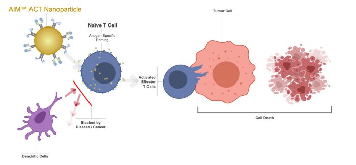 The AIM nanoparticles’ unique mechanism of action (MOA) optimizes endogenous T cells for maximum therapeutic effect and reinvigoration of natural immunity. Even when the dendritic cell is dysfunctional, the AIM nanoparticles can deliver critical natural signals to the T cell.