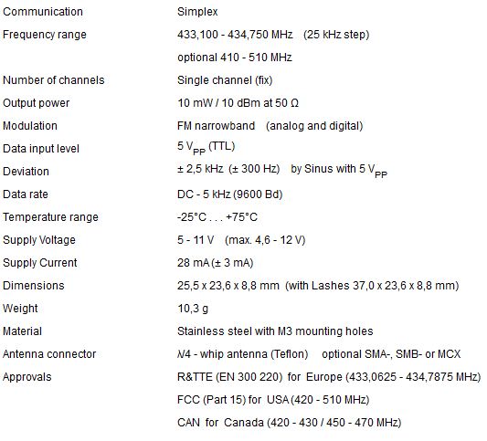 The UHF mini transmitter 70TX-M1 is one of the smallest crystal stabilized transmitter modules in its class. A wide voltage range and its low power consumption combined with the small size makes the module ideal for portable and mobile applications. By the interesting combination of reliable technologies it was possible to design a product, putting together the advantages of frequency stable crystal oscillators and the synthesizer concept in a very small size The 70TX-M1 transmitter is a single channel, crystal stabilized solution, available for the frequency range from 410 to 510 MHz, mainly in the european 70cm ISM band from 433,100 to 434,75 MHz. The combination with our receiver modules 70RX-M1 or 70RX-S1 offers the user a perfect radio system with long distance communication at simplex or half-duplex. Together with our remote control unit FSM24 you can reach 2000 m and more at free sight.