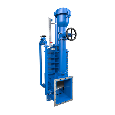 This narrow groove sliding penstock is designed to work with fluids at high speeds. Its main application is in run-offs at the bottom of dams.