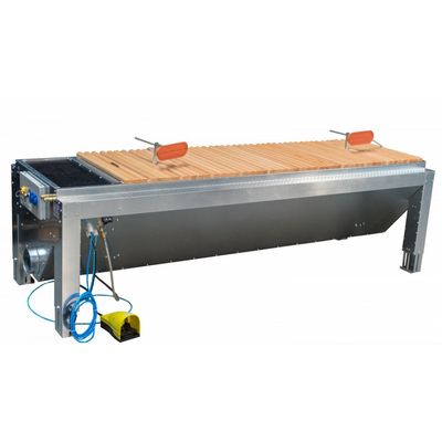 Sturdy galvanized plate structure with vacuuming around the edges, adjustable feet (H=750-1050 mm), damage-preventing wood grate support, compressed air coupling 6 - 8 bar, vacuum connection, socket strip with tool rack, main switch and switch for the automatic control of vacuum systems and stop valves. Standard layout: Vacuum connection and operating panel on the right. Without motor-operated hydraulic height adjustment, vacuum clamp device and suction plates (see accessories).