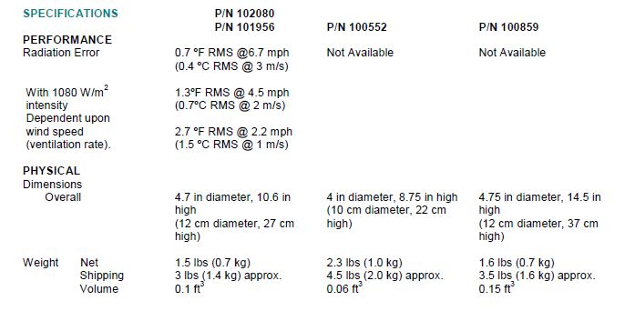 The Multi-Plate Radiation Shield, P/N 101956 and 102080, consists of twelve, white opaque molded, thermoplastic discs permitting easy air passage through the shield. This material provides high reflectivity, low thermal conductivity, and low heat retention. The unique disc profile provides positive blockage of direct and reflected solar radiation. Wind tunnel tests with maximum artificial radiation indicate that under conditions of low air movement (1m/s) the temperature sensor is maintained within 2.7 °F (1.5 °C) of ambient. This improves to 0.7 °F (0.4 °C) or less at wind speed greater than 3 m/s.