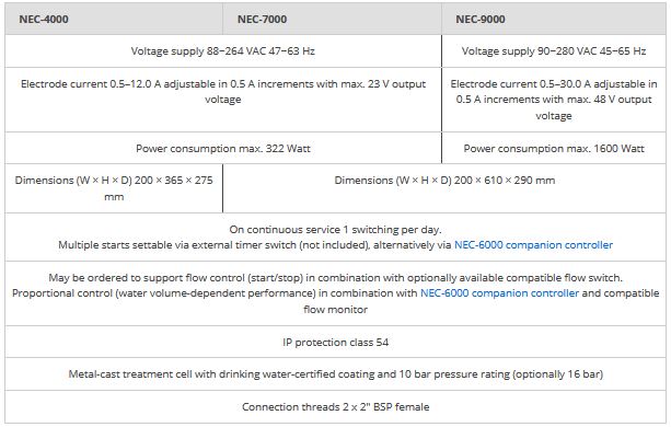 - Whereas NEC-7000 (not depicted) combines that same super-sized design and electrode of NEC-9000 with the rock-solid performance of NEC-4000, for requirements that prioritise electrode lifetime over performance (e.g. public pools).