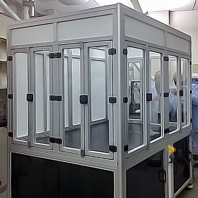 Negative Pressure Airflow Design for Operator and Environment Protection; Construction. Manufactured with standard 45mm extrusion and 1/4" clear polycarbonate panels. Deck work surface and custom shelving using ¾" black TRESPA©. Designed with multiple hinged operator access doors. The rear is designed with two(2ea)lift-off access panels. Designed to exhaust directly into customer facility house exhaust via single 6" or dual 4" exhaust ports. Two(2ea)Acuity Lithonia LED strip light fixtures. Includes four(4ea)levelling casters. The control panel includes; On/Off switch for LED lighting. Power input module. Roxtec EZ4 Entry.