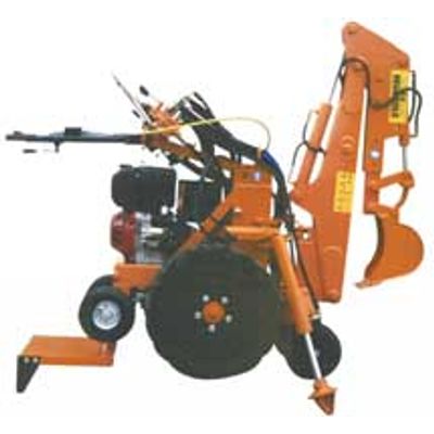 Motorized mini-excavator from 5 to 6 kW with 2 driving wheels, walk-behind model with hydraulic stabilizers. Variable excavation depth from 1.2 to 1.6 m, and 120° arm rotation.