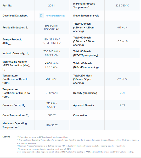 B+ family has improved magnetics relative to our B family. Technological advances by Magnequench have enabled multiple cobalt-free MQP-B+ grades as well as the industry’s highest (BH)max powder.