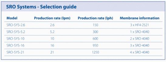 - 5 systems are included in the range to meet RO water production levels of 150 to 1250 litres per hour.