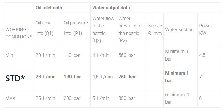 Features : FEEDING : Discharge. CALIBRATION : Unloader valve. SECONDARY FLUID : Fresh water, salt water, glycole, chemicals. WATER TEMPERATURE : Cold or hot water up to 60° C. OIL TEMPERATURE : Max 70 °C.
