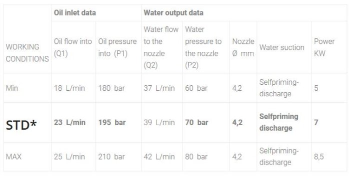 *STD Standard calibration done by Neròn.. Different or adjusted calibration done upon customer’s request. The above stated values are subject to variations depending on the oil temperature of the hydraulic system.