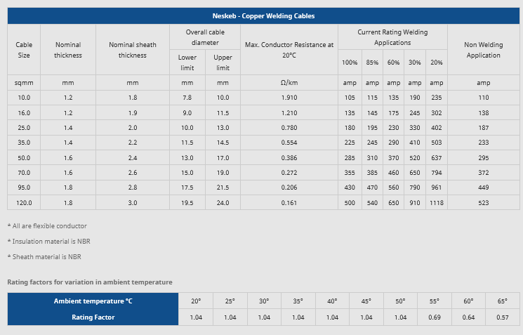 The maximum current ratings of flexible welding cables for different duly cycles are based on an ambient air temperature of 25 C and a maximum conductor temperature of 90 C. The percentage duly cycles for various processes and applications are as follows:
